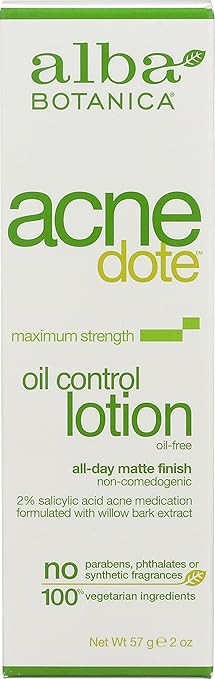 Take control of your skin with Alba Botanica Acnedote Maximum Strength Oil Control Lotion. Made with a 2% salicylic acid and willow bark solution, this light moisturizer treats and prevents breakouts without drying your skin. This lotion helps fight oily and greasy skin and leaves your skin clear and hydrated. Our formula is powered by botanicals like aloe leaf juice and witch hazel to calm the skin. Our 100% vegetarian formula is oil-free and does not contain any parabens, phthalates, or synthetic fragrances. It is also not tested on animals. Includes one 2 oz. tube of Alba Botanica Acnedote Maximum Strength Oil Control Lotion. At Alba Botanica, our product family constantly evolves alongside health, beauty, and ingredient knowledge and trends. We’re dedicated to making high quality, 100% vegetarian products that overflow with botanical ingredients. Do beautiful – that’s the motto that motivates our body loving products that nourish the skin, hair and, of course, the soul.