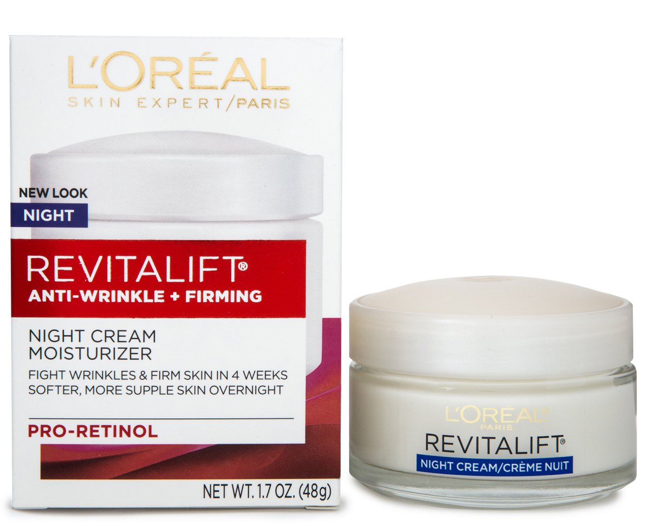 L'Oreal Revitalift Anti-Wrinkle + Firming Night Cream 1.7 oz. This new and improved formula provides smoother and firmer skin in 4 weeks. Rejuvenates the skin overnight. The ultra nourishing texture of Revitalift Night Cream is quickly absorbed into the skin. Powerful ingredients, Pro-Retinol A, Pro-Lastyl, and Criste Marine Extract, increases cell turnover, reduces wrinkles, firms skin and provides 24-hours of lasting moisture. This nighttime moisturizer delivers anti-wrinkle and firming action while you sleep. Each morning, skin is measurably more resilient and toned.